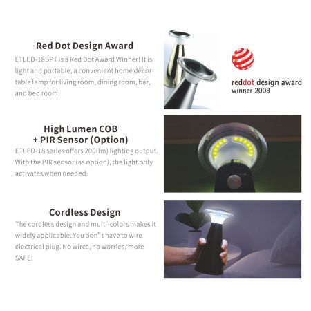 Our Red Dot Awarded table lamp is upgraded with high lumen COB & PIR sensor. The new series (18 series) are able to keep users' home, elders, children in safe surroundings.With the portable design, it can be placed anywhere according to users' ideas of home decor and commercial decor.