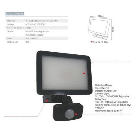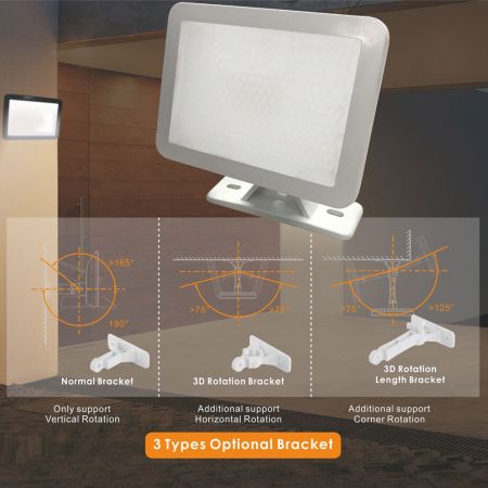 The slim LED flood light has a 3D adjustable bracket , the adjustable and flexible design makes it much easier for users to adjust the bracket according to their needs. The bracket of LED Flood Light & Sensor Light has 3 types of rotations and can be used anywhere: