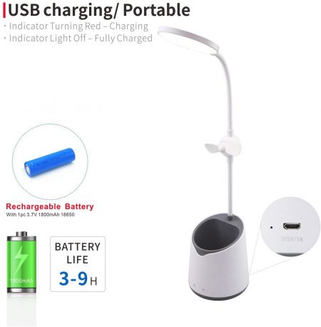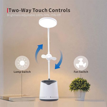 Lámpara de escritorio multifuncional con mini ventilador y portalápices/Lámpara de mesa recargable por USB e inalámbrica