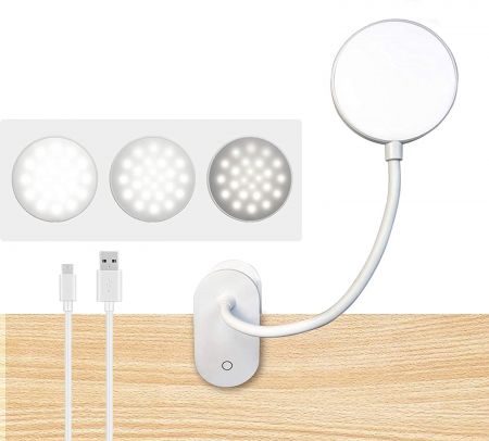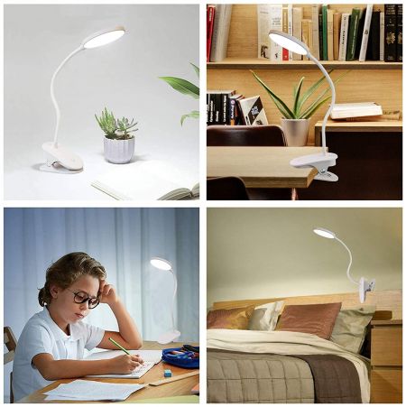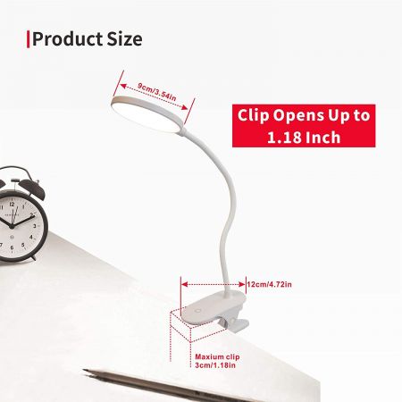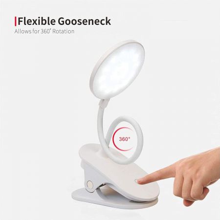 la lampe avec pince est réglable et intensité variable. La commande tactile marche/arrêt avec 3 niveaux de luminosité (100 %, 50 %, 20 %) permet à la lampe de lecture LED de s'adapter à vos préférences, et le col de cygne à 360° vous permet d'éclairer dans différentes positions ou angles selon vos besoins.